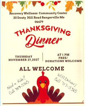 The Recovery and Wellness Community Center is putting on a Thanksgiving Dinner to anyone that would like to join. Will be held at 1PM on Thursday November 27, 2025 at 20 Douty Hill Road in Sangerville