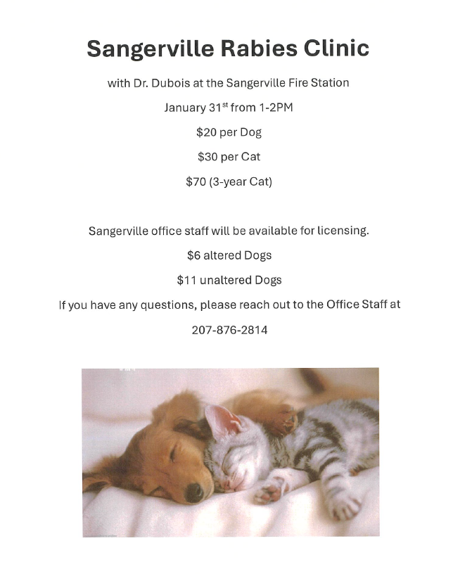 Sangerville Rabies Clinic at the Fire Department January 31st 1-2 PM.