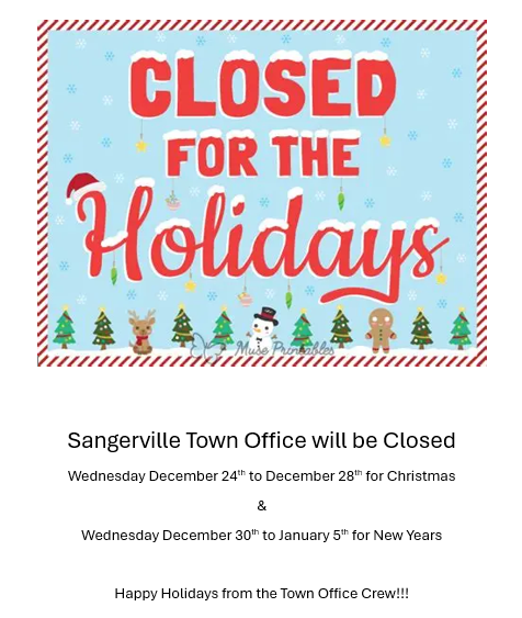 The town office will be closed December 24th to December 28th and December 20th to January 5th.